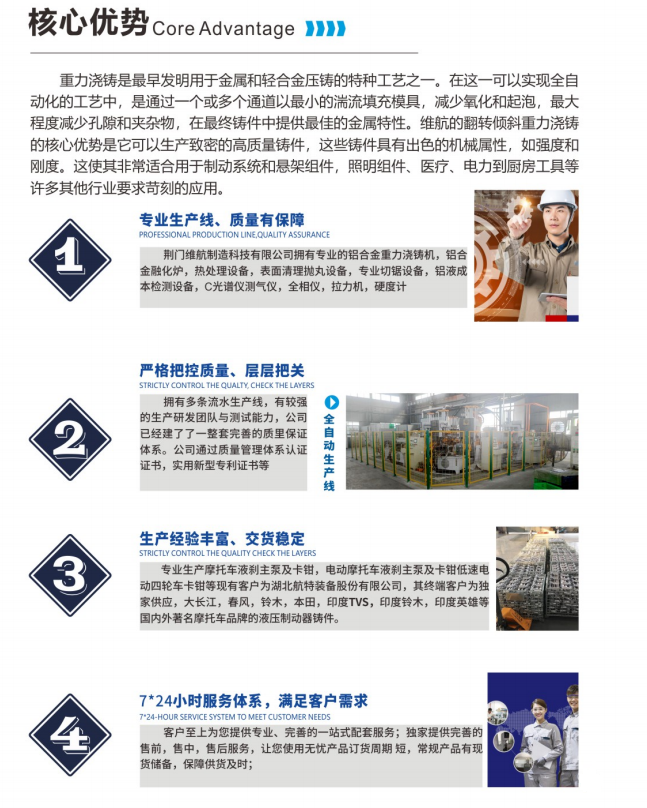 目前公司擁有半自動重力鑄造線一條,配半自動0-90°重力翻轉澆鑄機9臺,日產(chǎn)能可達6500件標準卡鉗。